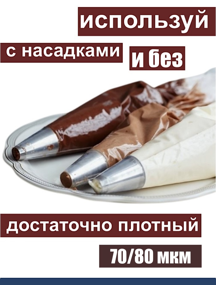 Используется как с кондитерскими насадками так и без них. Для любителей и профессиональных кондитеров. Цена зависит от упаковки, выбирайте нужную и добавляйте в корзину. Материал: прочный пищевой полиэтилен особой плотности 70 мкм.