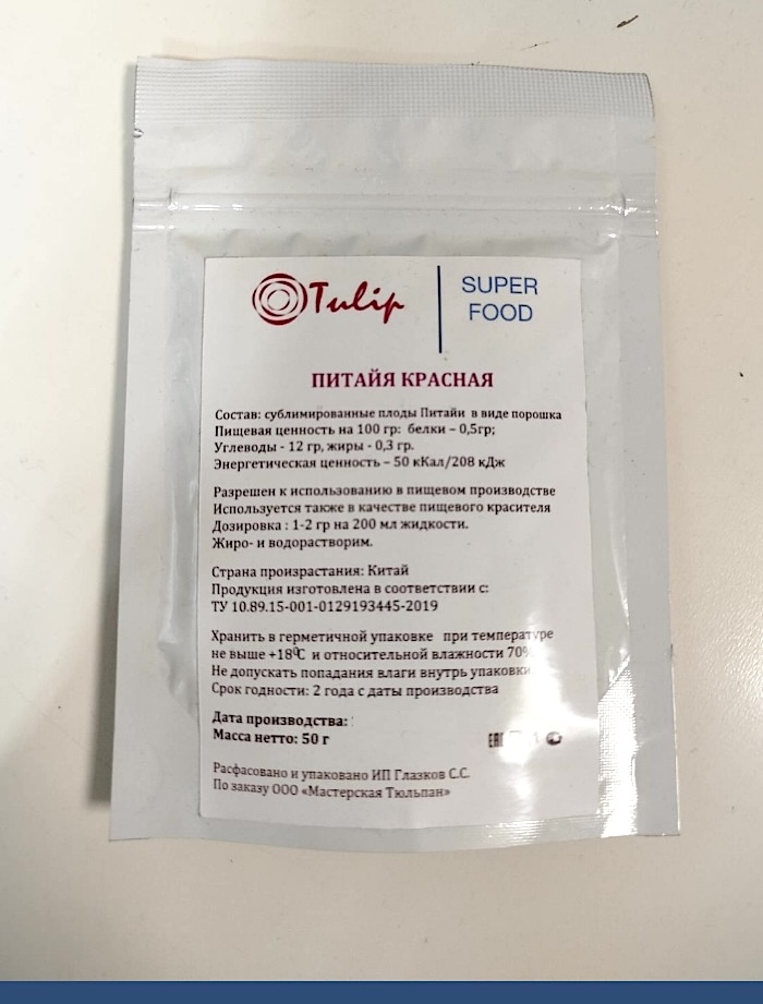 Сублимированный порошок-пудра плодов питайи не имеет посторонних примесей, мгновенно растворяется в любой жидкости, не обладает ярким вкусом, энергетическая ценность 50 ккал/100 г, белки 0.5 г, углеводы 12 г, жиры 0.3 г.