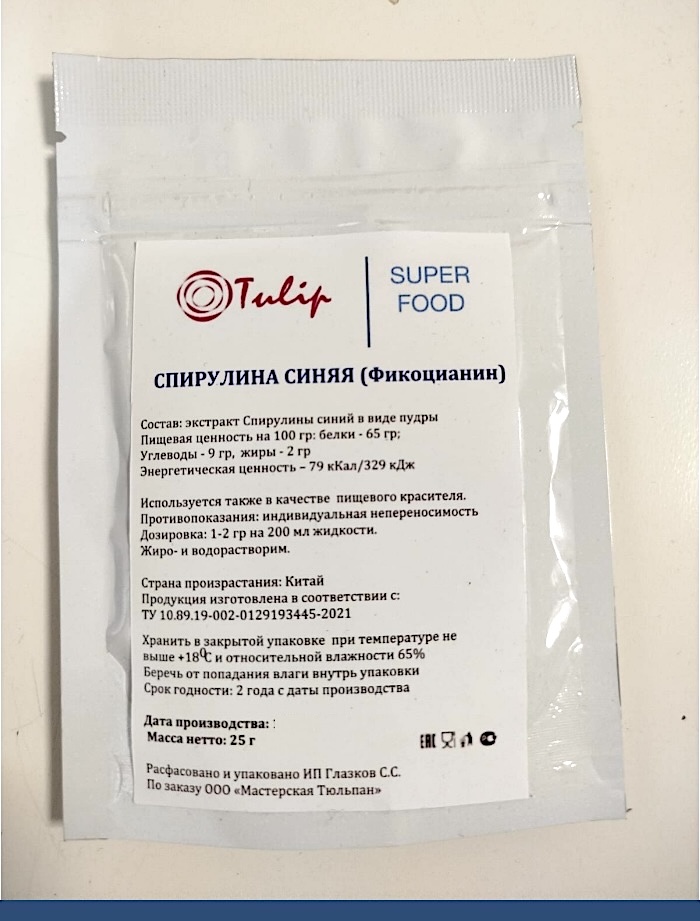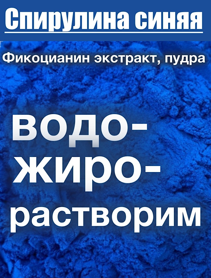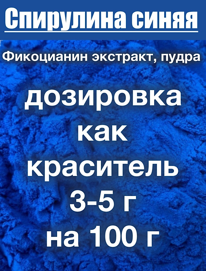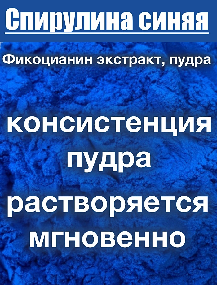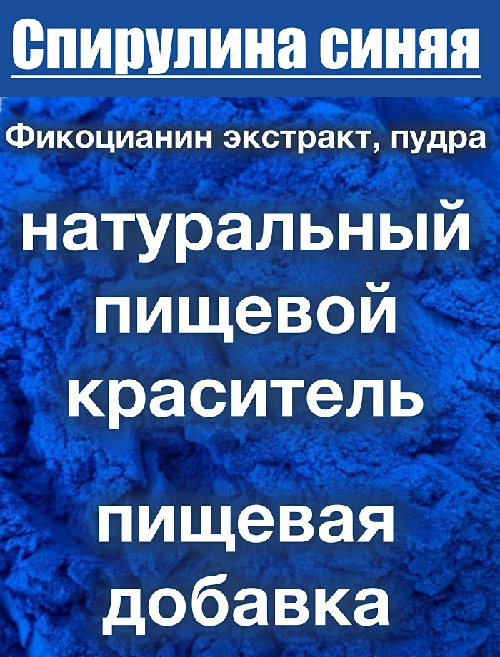 Краситель натуральный пищевой сухой спирулина синяя, это 100% натуральный порошок фикоцианин, это экстракт белков и водорастворимых пигментов, содержится в некоторых водорослях, например, спирулине, консистенция пудра, растворяется мгновенно. Придаст продукту глубокий синий цвет.