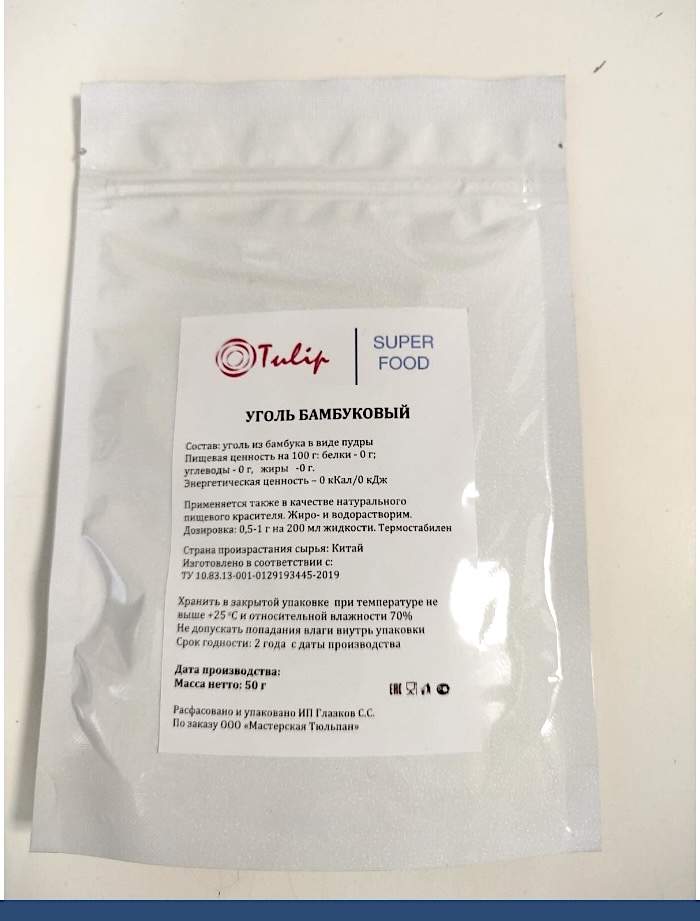 Краситель натуральный пищевой сухой уголь из бамбука, это 100% натуральный порошок угля из бамбука, консистенция пудра, растворяется мгновенно. Придаст продукту глубокий чёрный цвет.