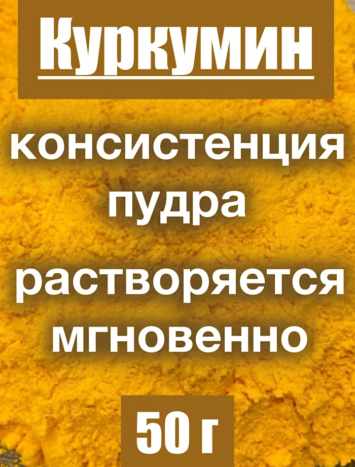 Куркумин жёлтый не имеет посторонних примесей, мгновенно растворяется в любой жидкости, не обладает ярким вкусом, энергетическая ценность 319 ккал/100 г, белки 15 г, углеводы 59 г, жиры 10 г.